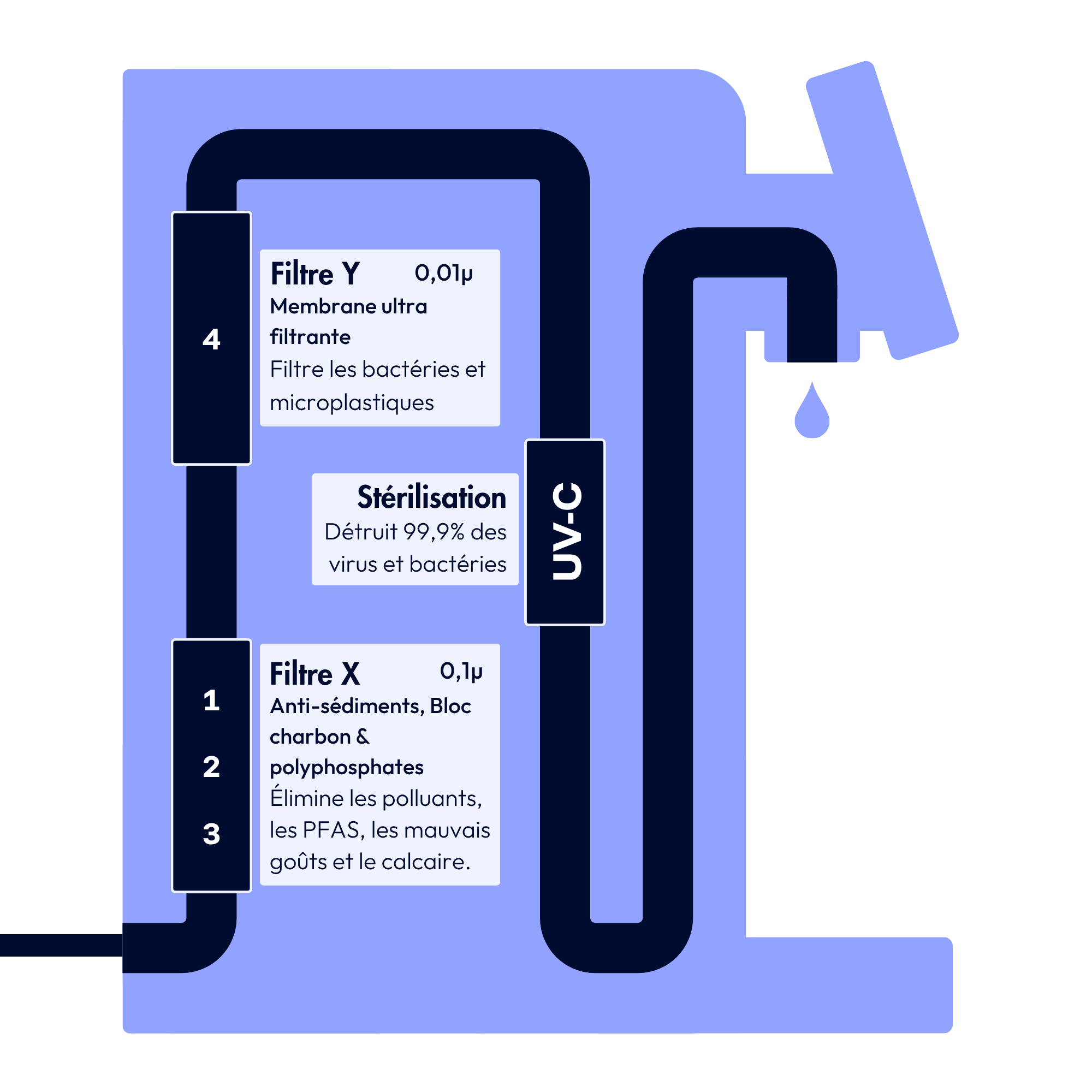 Une filtration de pointe : Nos fontaines filtrantes utilisent une technologie en 4 étapes qui garantit une eau pure, saine, et bonne à boire, tout en préservant les minéraux essentiels :